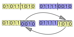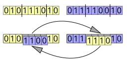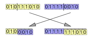 Se selecciona un punto en el vector del primer parental. Todos los datos más allá de este punto en el vector del organismo se intercambiarán entre los dos organismos parentales. Los organismos resultantes son los hijos: