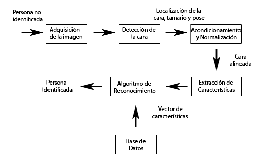 - Alineación de la cara: localiza los componentes de la cara y, mediante transformaciones geométricas, la normaliza respecto propiedades geométricas, como el tamaño y la pose, y fotométricas, como la iluminación. Para normalizar las imágenes de caras, se pueden seguir diferentes reglas, como la distancia entre las pupilas, la posición de la nariz, o la distancia entre las comisuras de los labios. También se debe definir el tamaño de las imágenes y la gama de colores. Normalmente, para disminuir la carga computacional del sistema, se acostumbra a utilizar imágenes pequeñas en escala de grises. A veces también se realiza una ecualización del histograma.