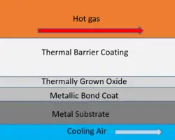 En las condiciones de funcionamiento máximas que se encuentran en los motores de turbina de gas con temperaturas superiores a 700 °C, la oxidación de la capa de unión conduce a la formación de una capa de óxido de crecimiento térmico (TGO). La formación de la capa de TGO es inevitable para muchas aplicaciones de alta temperatura, por lo que los recubrimientos de barrera térmica a menudo se diseñan para que la capa de TGO crezca lenta y uniformemente. Tal TGO tendrá una estructura que tiene una baja difusividad para el oxígeno, de modo que el crecimiento adicional se controla mediante la difusión del metal de la capa de unión en lugar de la difusión de oxígeno desde la capa superior.[5]