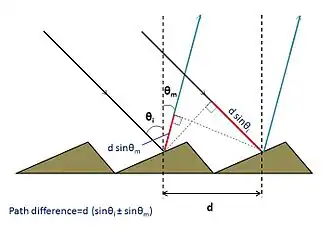 Una rejilla ideal está formada por un conjunto de rendijas de espaciado d, que deben ser más anchas que la longitud de onda a estudiar para causar difracción. Suponiendo una onda plana de luz monocromática de longitud de onda λ con incidencia normal (perpendicular a la rejilla), cada rendija en la rejilla actúa como una fuente casi puntual desde la que la luz se propaga en todas direcciones (aunque esto típicamente se limita a un hemisferio). Después de que la luz interactúa con la rejilla, la luz difractada se compone de la suma de los componentes de onda interfering que emanan de cada rendija de la rejilla. En cualquier punto dado en el espacio a través del cual puede pasar la luz difractada, la longitud del camino a cada rendija en la rejilla varía. Dado que la longitud de la trayectoria varía, por lo general, también lo hacen las fases de las ondas en ese punto desde cada una de las rendijas. Por lo tanto, se suman o restan entre sí para crear picos y valles a través de fenómenos de adición e interferencia. Cuando la diferencia de trayectoria entre la luz de las rendijas adyacentes es igual a la mitad de la longitud de onda, λ2, las ondas están desfasadas y, por lo tanto, se cancelan entre sí para crear puntos de mínima intensidad. De manera similar, cuando la diferencia de la longitud de la ruta es λ, las fases se suman y se producen máximos. Para un rayo que incide normalmente en una rejilla, los máximos se registran en los ángulos θm, que satisfacen la relación d sinθmλ = | & thinsp; m & thinsp; |, donde θm es el ángulo entre el rayo difractado y el vector normal de la rejilla, y d es la distancia desde el centro de una rendija al centro de la rendija adyacente, y m es un número entero que representa el modo de propagación estudiado.