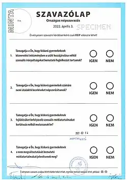 | Referéndum de Hungría de 2022 1. ¿Apoya la celebración de eventos informativos sobre orientación sexual para menores, en instituciones de educación pública sin el consentimiento de los padres? 2. ¿Apoya la promoción de los tratamientos de reasignación de género a los menores? 3. ¿Apoya la exposición sin restricciones de menores al contenido de medios sexualmente explícito, que puede influir en su desarrollo? 4. ¿Apoyas mostrar contenido multimedia a menores sobre procedimientos de cambio de género? | |||||||||||