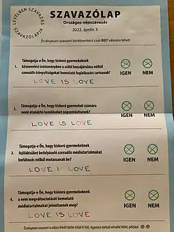 Una declaración conjunta de 10 grupos húngaros LGBT+ y de derechos humanos, incluidos Budapest Pride y Amnistía Internacional Hungría, pidió a los ciudadanos que den respuestas inválidas al referéndum, marcando cada círculo de las opciones "sí" y "no" en cada pregunta para "ayudar a garantizar que el referéndum excluyente del gobierno no alcance el umbral de validez".[11]