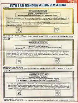 Derogación de la norma que impone aportes sindicales automáticos a los trabajadores. Referéndum promovido por los Radicales y la Liga Norte.