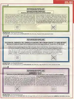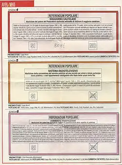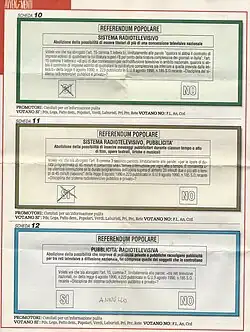 Derogación de las normas que permiten la concentración de dos cadenas de televisión. Promovido por miembros de algunas asociaciones de voluntariado, de promoción ambiental y cultural como el Mo.V.I. (Movimiento Voluntario Italiano), Legambiente, ACLI y ARCI; los primeros firmantes y presentadores fueron los secretarios nacionales o los presidentes de estas asociaciones.[7]