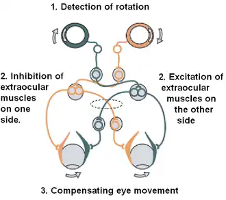 En instancia, si la cabeza es girada en el sentido del reloj como se ve arriba, entonces se envían impulsos excitatorios desde el canal semicircular en el lado derecho a través del nervio vestibular (par craneal VIII) a través del ganglio de Scarpa, y termina en el núcleo vestibular derecho en el tallo cerebral. Desde este, fibras excitatorias cruzan al núcleo abducens izquierdo. Allí se proyectan y estimulan el músculo recto externo del ojo izquierdo por el nervio abducens. En adición, las interneuronas internucleares del abducens y el núcleo oculomotor activan el músculo recto interno en el ojo derecho. Como resultado, ambos ojos girarán en contra de la dirección del reloj.