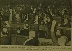 Después de que la UCRI se retirara y se rechazaran las impugnaciones a la Convención que exigían el reconocimiento de la Constitución de 1949, la asamblea pasó a tratar la cuestión del efecto de la proclama del dictador Aramburu, restableciendo el texto constitucional de 1853, con las reformas de 1860, 1866 y 1898. Sin embargo tampoco había acuerdo entre los partidos que sostenían la vigencia de la Constitución de 1853, presentándose dos despachos.[26] La UCRP y los conservadores sostenían que la Constitución de 1853 había comenzado a regir desde la proclama de Aramburu del 27 de abril de 1956, y que la Convención sólo debía ratificar su vigencia. Otro sector, en el que se encontraban los partidos Socialista y Demócrata Progresista, sostenía que el gobierno de facto no tenía facultades para establecer la Constitución y que el país se encontraba en ese momento sin Constitución, el 23 de septiembre dictó su primera norma rechazando las impugnaciones y "declarando" que la Constitución de 1853 se encontraba vigente:[12]