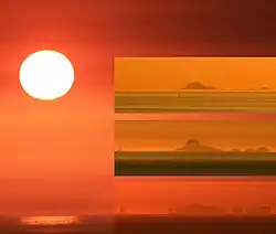 La refracción distorsiona el disco solar y lunar en una forma desigual a medida que se pone en el horizonte inferior.[6]