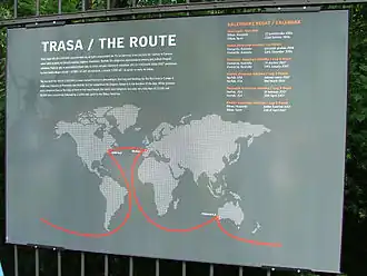 La vuelta alrededor del mundo se realiza hacia el este, partiendo de Estados Unidos, cruzando el Océano Atlántico hacia el sur, el Cabo de Buena Esperanza hacia el Océano Índico, el Cabo Leeuwin hacia el Océano Pacífico, el Cabo de Hornos hacia el Atlántico, y de vuelta hacia el norte.
