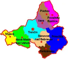 La región de Trenčín se subdivide en 9 distritos (en eslovaco okresy) y 274 municipios (obce):