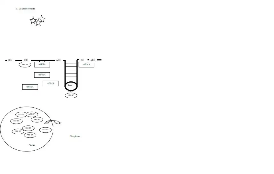 En las regiones 3´ UTR se unen dos tipos de elementos dando así dos tipos de regulación del RNAm: elementos cis y factores trans (Figura1), implicados en el cáncer (dan células tumorales, ya que regulan RNAm que codifican para componentes del ciclo celular). En células normales sin alterar, los RNAm en sus regiones 3´ UTR no presentan unión alguna de estos factores trans, mientras que en las células que si se encuentran alteradas se unen multitud de esos factores que alteran la estabilidad del RNAm y la eficiencia de su traducción.