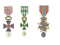 - Cruz del Primer Ejército o de Cataluña. Consta de cuatro brazos triangulares esmaltados en azul turquí. En el centro tiene un escudo circular con corona real en campo rojo y debajo los palos de Cataluña sobre oro. En el exergo se lee «Defensor de mi Rey y del Principado». En el reverso aparece el número «1». La cinta es blanca billeteada de rojo. Todo ello de acuerdo con la Real Orden de 31 de marzo de 1815.[8][9]