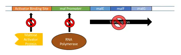En ausencia de otros elementos reguladores, el estado predeterminado de una transcripción bacteriana es estar en la configuración "activada", lo que resulta en la producción de cierta cantidad de transcripción. Esto significa que la regulación transcripcional en forma de represores de proteínas y elementos de control positivo puede aumentar o disminuir la transcripción. Los represores a menudo ocupan físicamente la ubicación del promotor, impidiendo la unión de la ARN polimerasa. Alternativamente, un represor y una polimerasa pueden unirse al ADN al mismo tiempo con una interacción física entre el represor que impide la apertura del ADN para acceder a la hebra negativa para la transcripción. Esta estrategia de control es distinta de la transcripción eucariota, cuyo estado basal debe estar apagado y donde los cofactores necesarios para el inicio de la transcripción son altamente dependientes de genes.[4]