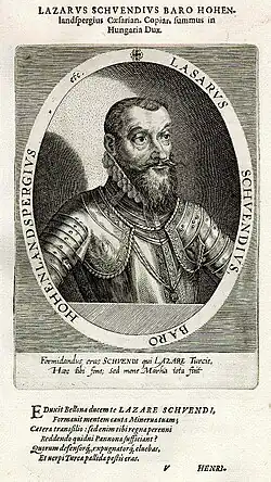 - ↑ El es el sobrino de la condesa Helene Eleonore von Schwendi