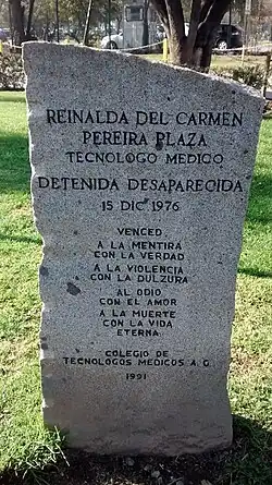 Reinalda Pereira Plaza trabajó como tecnóloga médica en el Hospital Sótero del Río, es por eso que en uno de sus jardines del recinto se inauguró un memorial que recuerda a la tecnóloga médica que fue detenida embarazada. Cada 15 de diciembre sus amigos se reúnen en ese lugar para recordar a Reinalda.[7]