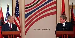 El presidente George W. Bush visitó Albania el 10 de junio de 2007 como parte de su gira por Europa, lo que lo convirtió en el primer presidente de Estados Unidos en hacerlo.[15] Fue recibido con gran fanfarria por los ciudadanos de Tirana. Una calle en la capital pasó a llamarse después de Bush.[16] Incluso una estatua de Bush fue erigida en la ciudad de Fushë-Krujë en julio de 2011.[17]