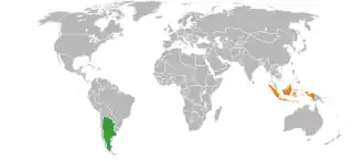Las relaciones entre Argentina e Indonesia se refieren a las relaciones bilaterales entre la República Argentina y la República de Indonesia. Desde las relaciones diplomáticas establecidas en 1956, las relaciones bilaterales entre Argentina e Indonesia se han vuelto cada vez más estratégicas.[1] Según el embajador de Argentina ante su homólogo indonesio Javier A. Sanz de Urquiza, Indonesia ha sido "un verdadero amigo de la Argentina" por el conflicto de soberanía de las Islas Malvinas.[2] Argentina tiene una embajada en Yakarta, mientras que Indonesia tiene una embajada en Buenos Aires. Ambos países dicen que comparten los mismos valores con respecto al orden internacional, y la misma aspiración de defender el interés de las naciones en desarrollo en el foro internacional.[2] Ambos países son miembros del Grupo de los 77, las economías más importantes del G-20, los países en desarrollo del G20 y el Foro de Cooperación de Asia Oriental y América Latina.