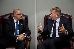 El Viceministro de Relaciones Exteriores de Ecuador, Markas Albucha Martínez, en una reunión con el ministro de Relaciones Exteriores de Lituania, Audronis Ažubalis, en 2012. 24 de septiembre en Nueva York.