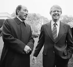 Alentado por Washington, Sadat inició negociaciones con Israel, que resultaron especialmente en los Acuerdos de Camp David negociados por el presidente Jimmy Carter e hicieron la paz con Israel en un histórico tratado de paz en 1979.[4] La política interna de Sadat, llamada 'Infitah', tenía como objetivo modernizar la economía y eliminar los controles de mano dura de Nasser. Sadat se dio cuenta de que la ayuda estadounidense era esencial para ese objetivo, y le permitió retirarse del conflicto israelí y seguir una política regional de paz.[5]