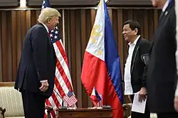 Después de que Presidente Rodrigo Duterte asumiera formalmente el cargo el 30 de junio de 2016, las relaciones entre EE. UU. Y Filipinas comenzaron a agriarse. La deriva entre la relación Duterte y Obama comenzó cuando el presidente de los Estados Unidos expresó su preocupación por los problemas de derechos humanos en la "Guerra de Filipinas contra la delincuencia y las drogas [del Presidente Duterte]". Según una declaración emitida por la Casa Blanca, Obama felicitó al país por su "democracia vibrante". Pero también destacó los "valores perdurables" que sustentaron sus "vínculos de larga data", incluidos los "compromisos compartidos con la democracia, los derechos humanos y el estado de derecho".[44] Esta intervención y la elección de palabras del presidente Duterte al hablar sobre el presidente Obama durante una conferencia de prensa, en la que infame lo llamó "un hijo de puta", dio lugar a una reunión cancelada entre los dos líderes durante la cumbre de la ASEAN de 2016, celebrada en Laos.[45]