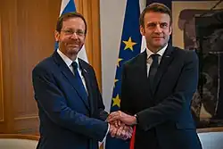 - ↑ «Macron Urges French Unity in Response to Hamas Attack, Israeli Airstrikes». The Wall Street Journal. 14 de octubre de 2023.