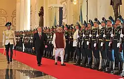 El Príncipe Heredero de Abu Dhabi, Vicecomandante Supremo de las Fuerzas Armadas de EAU, General Sheikh Mohammed Bin Zayed Al Nahyan, recibido por el presidente, Shri Pranab Mukherjee, y el primer ministro, Shri Narendra Modi.