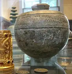 Cuando fue encontrado por el arqueólogo Charles Masson durante su trabajo en Afganistán entre 1833 y 1838, el relicario contenía monedas del rey indoescita Azes II, a pesar de que en las recientes investigaciones de Senior indica que Azes II nunca existió,[1] y se encontraba atribuido a su reinado, probablemente debería ser reasignado a Azes I. Sin embargo, otra investigación de 2015 atribuye las monedas al rey indoescita Kharahostes o a su hijo Mujatria, que hizo acuñaciones póstumas en nombre de Azes.[2]