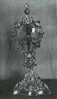 La custodia tenía forma de flor de lis, estaba hecho de oro y se encontraba guarnecido de perlas, diamantes, esmeraldas y otras piedras preciosas.