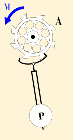 - Pasador de impulso: el pasador descentrado en un disco en el eje del volante que es empujado por la horquilla de la palanca para mantener el volante en movimiento.