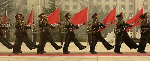 El Ejército Popular de Liberación fue fundado el 1 de agosto de 1927 —lo que se puede ver reflejado en los caracteres chinos 八一 en su insignia, que significan ‘ocho uno’, es decir, 1 de agosto— como la fuerza de combate del Partido Comunista en la guerra civil china, bajo el nombre de Ejército Rojo (en chino simplificado, 红军; pinyin, hóngjūn).[164]Durante la Segunda Guerra Mundial se integró en el Ejército Nacional Revolucionario para combatir la ocupación japonesa y, una vez ganada la guerra, tomó su denominación actual y prosiguió de nuevo de forma independiente el enfrentamiento con los nacionalistas que fueron finalmente derrotados en 1949.[165]Desde entonces ha intervenido en varios conflictos tanto en territorio chino como fuera de este, como es el caso del Conflicto Sino-Vietnamita o las Protestas de la Plaza de Tian'anmen de 1989. Hu Jintao estableció que los objetivos del Ejército Popular de Liberación eran la consolidación del estatus de mando del Partido Comunista; ayudar a asegurar la soberanía, integridad territorial y seguridad doméstica en orden a continuar el desarrollo, salvaguardar los intereses expansionistas de China y ayudar a mantener la paz mundial.[166]
