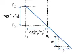 En otras palabras, F es proporcional a x elevado a la potencia de la pendiente de la línea recta de su gráfico logarítmico. En concreto, una línea recta en una gráfica logarítmica que contiene los puntos (F0, x0) y (F1, x1) tendrá la siguiente expresión: