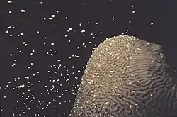 Cuando comienza el proceso de emisión, de los pólipos sale un paquete que contiene esperma y huevos, recubiertos estos de una capa lipídica. Esta suerte de saco, por el cambio de presión, se rompe cuando sube a la superficie, y en ese momento los gametos se dispersan en el agua debido a las corrientes y al oleaje.