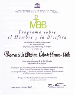 Desde el año 2005, la reserva de biosfera Cabo de Hornos (RBCH) ha sido miembro de la red Ibero-MaB de la UNESCO,[2][3] Los investigadores del Comité Científico de la RBCH[4] trabajan con un enfoque multidisciplinario y han ayudado al gobierno chileno en la definición de un plan de zonificación, que está destinado a facilitar tanto el desarrollo y los beneficios para la población local, como la conservación de la diversidad biocultural del archipiélago.
