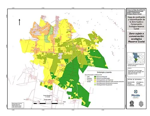 - ↑ «Reserva Ecológica Municipal Cuxtal». The Matrix. Mérida, Mexico: Municipal Government of Merida, Yucatán. Archivado desde el original el 24 de septiembre de 2015. Consultado el 9 de mayo de 2015.