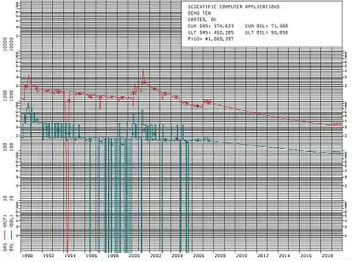 El método de la curva de disminución de producción utiliza datos de producción para ajustar una curva de disminución y estimar la producción futura de petróleo. Las tres formas más comunes de las curvas de disminución son exponencial, hiperbólica, y armónica. Se supone que la producción disminuirá siguiendo una curva suave, y por ello se deben hacer ciertas reservas para paradas del pozo por mantenimiento y restricciones en la producción. La curva puede ser expresada mediante una ecuación matemática o mediante su dibujo en un gráfico para estimar la producción futura. Posee la ventaja de (implicitamente) incluir los efectos de todas las características del reservorio. Para su construcción es preciso disponer de suficientes registros históricos como para tener una tendencia estadísticamente relevante para ajustar la curva, idealmente cuando la producción no se encuentra limitada por condiciones regulatorias y otras condiciones exógenas.[12]