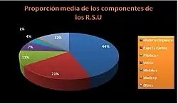 - Materia orgánica (supone el 44,06 %): derivada de restos de alimentos o de actividades vinculadas a la jardinería (podas, rastrillados de campos, cortado del césped, recogida de hojarasca...). Es la materia orgánica el principal componente orgánico de los residuos, aunque en las sociedades más desenvueltas tiende a disminuir.[2]