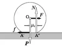 En las situaciones reales, los cuerpos se deforman, por poco que sea. El contacto no se realiza entonces a lo largo de una generatriz (como en el ejemplo anterior) sino a lo largo de una estrecha banda A′A″, como se muestra en la Figura 3. Ello da lugar a que aparezcan reacciones en los apoyos; reacciones que dan lugar a la aparición de un par que se opone la rodadura. Con la finalidad de simplificar el problema, podemos imaginar que en cada instante el cilindro debe rotar sobre la generatriz que pasa por A″ para poder rodar superando el pequeño obstáculo que se opone a ello. Eso equivale a considerar desplazada la línea de acción de la reacción normal N una distancia que designaremos por μr, como se muestra en la Figura 3. El par de resistencia a la rodadura y el par aplicado valen, respectivamente