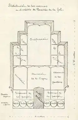 Según Pijoan, la predela habría sido tallada en algún momento posterior a su creación para ubicar una imagen en el centro de la composición. No queda claro si estaban tallados los dos pisos, tal y como muestra su croquis, o tan solo el piso superior para ubicar una repisa donde se asentaba la imagen en cuestión, como figura en su descripción.[31] A pesar de no contar con documentación sobre esta modificación, debió de ser anterior a 1677, ya que en una visita a Barbastro y Peralta de la Sal del padre Luis Cavada, provincial de los escolapios en Cerdeña se nombra la existencia de una imagen de San José de Calasanz en el retablo.[7] Se desconoce el destino de la predela, si bien el estudio de Ruiz y Velasco recoge que podría haber estado en 1942 en poder del anticuario Domingo Viñals, que tenía buenas relaciones con el obispo de la Seo de Urgel Juan Bautista Benlloch y Vivó.[32]