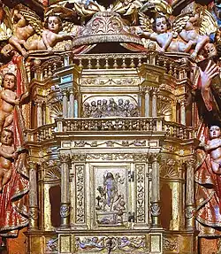 A medio camino entre el manierismo y el arte renacentista, aunque más tendente al primero, el sagrario ocupa el nicho central del primer cuerpo, bajo un falso pabellón donde varios querubines descorren una cortina. La pieza en sí posee gran valor en lo que a arquitectura se refiere; se estructura en dos cuerpos con tres calles sobre una base en cuya sección central se halla un cajón, elemento normalmente utilizado para guardar los corporales y ornamentado tan solo con dos angelotes simétricos portadores de guirnaldas y una cartela centrando el cierre. El primer cuerpo, que es el principal, cuenta como elemento decorativo primordial con una puerta en la que se halla en bajo relieve la Resurreción y a ambos lados dos franjas verticales de corte puramente renacentista, destacando bucráneos, frutas y mascarones, mientras que las calles de los extremos lucen pequeños pilares de orden corintio y fuste terciado, con el tercio inferior decorado con rostros angelicales y los otros dos tercios con estrías en vertical y destacando en las calles laterales unos nichos avenerados de medio punto que seguramente mostraban imágenes representativas de San Pedro y San Pablo, hoy perdidas. Por su parte, un friso de pequeñas dimensiones conduce al cuerpo superior, en cuya zona central se ubica un bajo relieve de la Última Cena, estando la calle central separada de las laterales por diminutos pilares dobles de fuste estriado. En las calles de los extremos, al igual que en las del cuerpo inferior, destacan nichos avenerados cuyas imágenes también se han perdido, si bien estos nichos, a diferencia de los otros, se cierran al igual que la zona central con una artística balaustrada compuesta de columnillas torneadas, muy parecida a la que corona el conjunto y que se sustenta en un friso idéntico al que divide ambos cuerpos. Por último, destaca en la cara interior de la puerta del sagrario una representación pictórica de la Fe en la que figura una matrona ataviada con prendas de gran volumen la cual porta una cruz en una mano y un cáliz en la otra.[1]: 102–104
