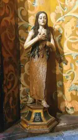 De autoría anónima al igual que la talla de San Juan Bautista y fecha desconocida, esta imagen fue colocada en el retablo en sustitución de una talla de Santa Bárbara del siglo xviii hoy situada frente al retablo de la Virgen del Pópulo, donde forma pareja con una talla también anónima de Santa Lucía fechada en la misma centuria.[6]: 54 [nota 6] La Magdalena se muestra en su iconografía tradicional (el crucifijo que sujetaba con su mano izquierda se ha perdido) y siguiendo el esquema impuesto por Pedro de Mena al igual que otra imagen del siglo xviii ubicada en la Capilla del Santo Cristo, de autor desconocido y procedente de Madrid.[6]: 88