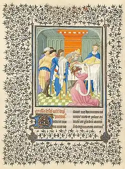 La tabla derecha es inusualmente dramática y también se desvía del relato del Evangelio. En lugar de en una prisión, la escena es mostrada en un interior palaciego.[10] En la mayoría de las representaciones hasta entonces, Salomé sostiene la bandeja vacía; aquí la cabeza ha sido colocada en el recipiente.[11] El cuerpo de Juan yace al pie de la escalera, expulsando sangre del cuello, mientras el verdugo, todavía sujetando la espada, entrega la cabeza a Salomé. Ella, según Lane, "evita su mirada", lo mismo que el verdugo, que gira la cabeza hacia la derecha. Al fondo, Salomé es mostrada presentando el despojo a su madre, la princesa Herodías, que aparece durante el Festín de Herodes.