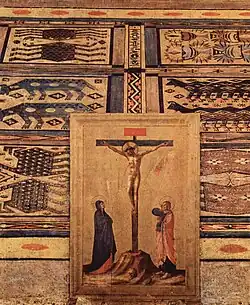 En los orígenes de la Orden Dominica, solo se permitían crucifijos esculpidos o pintados en los retablos.[2] El crucifijo seguía siendo un componente fundamental de los muebles del altar, ya que representaba el paralelo más cercano a la acción de la Misa y la consagración del cuerpo y la sangre de Cristo. El fondo dorado, la figura arcaísta y el marco casi dorado de la crucifixión del retablo de san Marcos aclaran que se supone que se debe ver como una pintura separada. El hecho de que realza el naturalismo del trabajo detrás de él debido a su apariencia como otra pintura, no una parte real de la escena, lo convierte en un ejemplo perfecto de tampantojo. Además de la crucifixión en sí, su ubicación en relación con las predellas a continuación juega un papel importante. Angelico colocó la predela Entombment of Christ directamente debajo de la crucifixión en el panel principal, lo que le da al retablo una función eucarística. El posicionamiento conecta la crucifixión y el entierro de forma temática y visual, de modo que uno suceda al otro. La pax de la crucifixión también puede aludir a una conexión entre los santos Cosme y Damián, ya que ellos también fueron condenados a la cruz, como se muestra en el extremo derecho de la predela. La comparación de Cristo con los santos patrones eleva a estos en un pedestal. La pax, gracias al efecto trmpantojo, recuerda al espectador que los mundos del Hombre y Cristo están conectados. A través de la combinación de insinuaciones religiosas y políticas, Angelico elogia a la familia Medici, insinuando que la Divina Voluntad determinó sus fortunas políticas en la ciudad sobre la cual Cosme ejercía cada vez más control.
