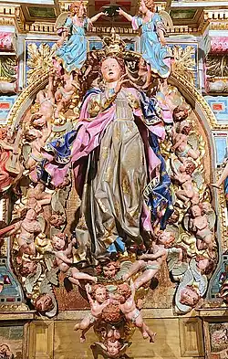 El retablo, de estilo barroco y rica policromía de colores vivos, se compone de un cuerpo con una sola calle, banco y ático. La talla de la Virgen, vestida con túnica ceñida con cíngulo y sobre esta un manto estrellado de gran movimiento, se sitúa en el cuerpo y figura rodeada de un nutrido coro angelical desde la peana hasta la cúspide, destacando cuatro ángeles (dos a cada lado) portando instrumentos de cuerda y dos en la parte superior en posición de sostener sobre la cabeza de María una corona real suspendida de la cornisa que separa el cuerpo del ático. La Virgen muestra el rostro alzado y los brazos en actitud de elevarse con las manos abiertas, faltando el dedo meñique de la mano izquierda. Destaca una profunda grieta en la imagen mariana la cual asciende desde la cabeza del ángel situado en la base de la talla hasta aproximadamente la rodilla de la pierna derecha de la Virgen, junto a la cual se halla otra grieta de menor longitud. A ambos lados se observan dos prominentes ménsulas de rocalla y dos pares de columnas salomónicas decoradas con racimos y hojas de vid y coronadas por capiteles corintios.
