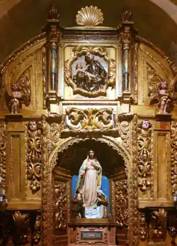 Respecto al ático, este alberga un nicho idéntico al del cuerpo aunque de menor tamaño coronado por un medallón circundado por rayos y presidido por una imagen del Espíritu Santo bajo forma de paloma.[2]: 437 El nicho lo preside una talla de madera del Niño Jesús de Praga de 0,70 metros; esta imagen es una talla lígnea de vestir que de acuerdo con el inventario de 1983 fue elaborada en el siglo xx,[5]: 193 probablemente en las dos primeras décadas de la centuria puesto que en un libro de fábrica consta el pago de su peana en 1917. Por otro lado, dicho inventario sitúa la factura de la Inmaculada Concepción también en el siglo xx; en base al estilo de la imagen y por la presencia de esta advocación en la imaginería de la iglesia en la década de 1950,[4]: 90–91 podría afirmarse que la pieza data de la primera mitad del siglo, circunstancia extrapolable a las imágenes de Santa Lucía y Santa Cecilia por poseer un estilo similar,[2]: 438 procediendo al menos la figura de Santa Cecilia de los talleres de Olot.[10]