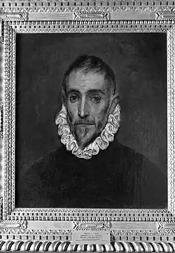 El personaje aparece de busto, ante un fondo neutro oscuro, la cabeza un poco ladeada y los ojos ligeramente desviados, mirando al espectador. La luz se concentra en la cabeza, que en el presente lienzo emerge con extraordinaria fuerza sobre una estrecha lechuguilla blanca. Se considera uno de los mejores retratos del Greco, pues consigue plasmar la complejidad del personaje a través de pinceladas finas y gruesas.[4] La extraordinaria expresividad y atractivo de este retrato explican las copias que de él existen.[5]