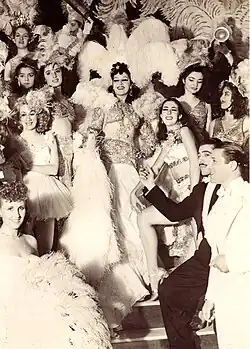 En marzo de 1954, la revista porteña se conmocionó con el estreno del espectáculo de la compañía del Folies Bergère de París en el teatro Ópera, contratada por el empresario Clemente Lococo.[2][50] Titulado Folies de París, el espectáculo fue una megaproducción prohibida para menores de 18 años con todo traído de Francia, incluyendo elenco, director, vestuario, coreográfo y escenografía.[2][51] Al año siguiente se estrenó otro espectáculo francés, el del Lido de París, con igual repercusión.[52] La reacción de la escena revisteril porteña a las presentaciones francesas fue inmediata, estrenando obras que exaltaban lo nacional en contraposición a ellas o que aludían al uso que hacían del desnudo,[37] tales como: Gran Festival Porteño y Estos churros son caseros en el Maipo; ¡Chau belleza!, De París llegó el desnudo, El Folies se hizo porteño e Igualito que París en el teatro Comedia; Buenos Aires versus París en El Nacional; y Los misterios del desnudo y Se dio el desnudo en el teatro Argentino.[53] Aunque el impacto de la llegada del Folies y el Lido recuerda al de los espectáculos franceses de los años 1920, Prestigiacomo señaló que «a diferencia de lo que pasó con las francesas de Madame Rasimi en 1922, [no dejaron] mucha huella en la revista porteña, ya lo suficientemente afrancesada para el gusto rioplatense».[53] La influencia francesa se hizo notar en un renovado gusto por el lujo y la opulencia en escenografías y vestuario, la presencia de coristas semidesnudas, el diseño de programas de sala más elaborados y la incorporación de artistas como Christine Niky, Xenia Monty y May Avril, que decidieron quedarse en la ciudad para trabajar en la revista porteña.[53] Las vedettes argentinas comenzaron a incorporar el desnudo en sus presentaciones, siendo Thelma del Río la primera en atreverse, aunque, a diferencia de los espectáculos franceses, el público de la revista porteña mostró preferencia por la insinuación máxima en lugar del desnudo total, que consideraban poco elegante.[37][54]