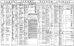 Clasificación del "reino animal" en Systema Naturae de Linneo (1735). El diseño de la nomenclatura binomial dotó a la biología de una herramienta de clasificación científica de primera magnitud