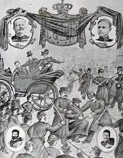 La familia real se encontraba entonces en el Palacio Ducal de Vila Viçosa,[45] pero los acontecimientos llevaron al rey Carlos a adelantar el regreso a Lisboa. Tomó el tren en la estación de Vila Viçosa en la mañana del día 1 de febrero. La comitiva real llegó a Barreiro ya por la tarde. Para atravesar el río Tajo tomó el barco de vapor D. Luís y desembarcó en Praça do Comércio sobre las 17:00.[47] A pesar del clima de gran tensión, el rey optó por ir en carruaje abierto con una reducida escolta para demostrar normalidad.[45] Mientras saludaban a la multitud presente en la plaza, el carruaje fue alcanzado por varios disparos. Un tiro de carabina atravesó el cuello del rey,[47] matándolo en el acto.[45] Los disparos continuaron y el príncipe logró acertar a uno de los atacantes pero fue enseguida alcanzado en la cara por otro disparo.[45] La reina, de pie, se defendió con un ramo de flores que le habían regalado fustigando a uno de los atacantes que había subido al estribo del carruaje al grito de: «¡Infames! ¡Infames!».[14] El infante Manuel también fue alcanzado en un brazo.[14] Dos de los regicidas, Manuel Buíça, profesor de primaria, y Alfredo Costa, empleado del comercio e editor, murieron en el lugar. El resto huyó. El carruaje entró en el arsenal de la Marina donde se constató la muerte del rey y la del heredero al trono.[14]