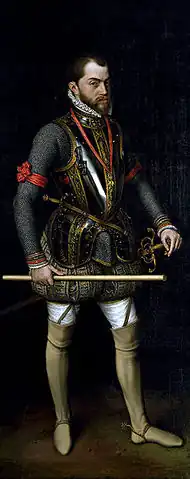 - ↑ Motley, John Lothrop (1885). The Rise of the Dutch Republic I. Harper Brothers. «As Philip was proceeding on board the ship which was to bear him forever from the Netherlands, his eyes lighted upon the Prince. His displeasure could no longer be restrained. With angry face he turned upon him, and bitterly reproached him for having thwarted all his plans by means of his secret intrigues. William replied with humility that every thing which had taken place had been done through the regular and natural movements of the states. Upon this the King, boiling with rage, seized the Prince by the wrist, and shaking it violently, exclaimed in Spanish, "No los estados, ma vos, vos, vos! " repeating thrice the word vos, which is as disrespectful and uncourteous in Spanish as "toi" in French.»