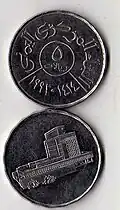 5 riales | 1993- | Acero | Circular | 23,00 | 4,50 | Estriado | Edificio del - Banco Central de Yemen | ريال ٥ - البنك المركزي اليمني - año de acuñación | |