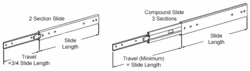 Las guías o correderas se pueden construir con dos o más secciones.[5] Cuando tiene dos secciones, solo puede extenderse aproximadamente unos 3/4 de su longitud total comprimida. Una guía compuesta normalmente tiene tres secciones: un miembro intermedio fijo y flotante y la sección unida al cajón. Un diseño compuesto puede extenderse al menos hasta la longitud del diapositivo comprimido y, por lo general, un poco más. En el caso de las guías de cajones, esto permite sacarlos por completo del mueble donde se alojan, lo que permite el acceso para el servicio o la conexión de cables en la parte posterior del mueble.